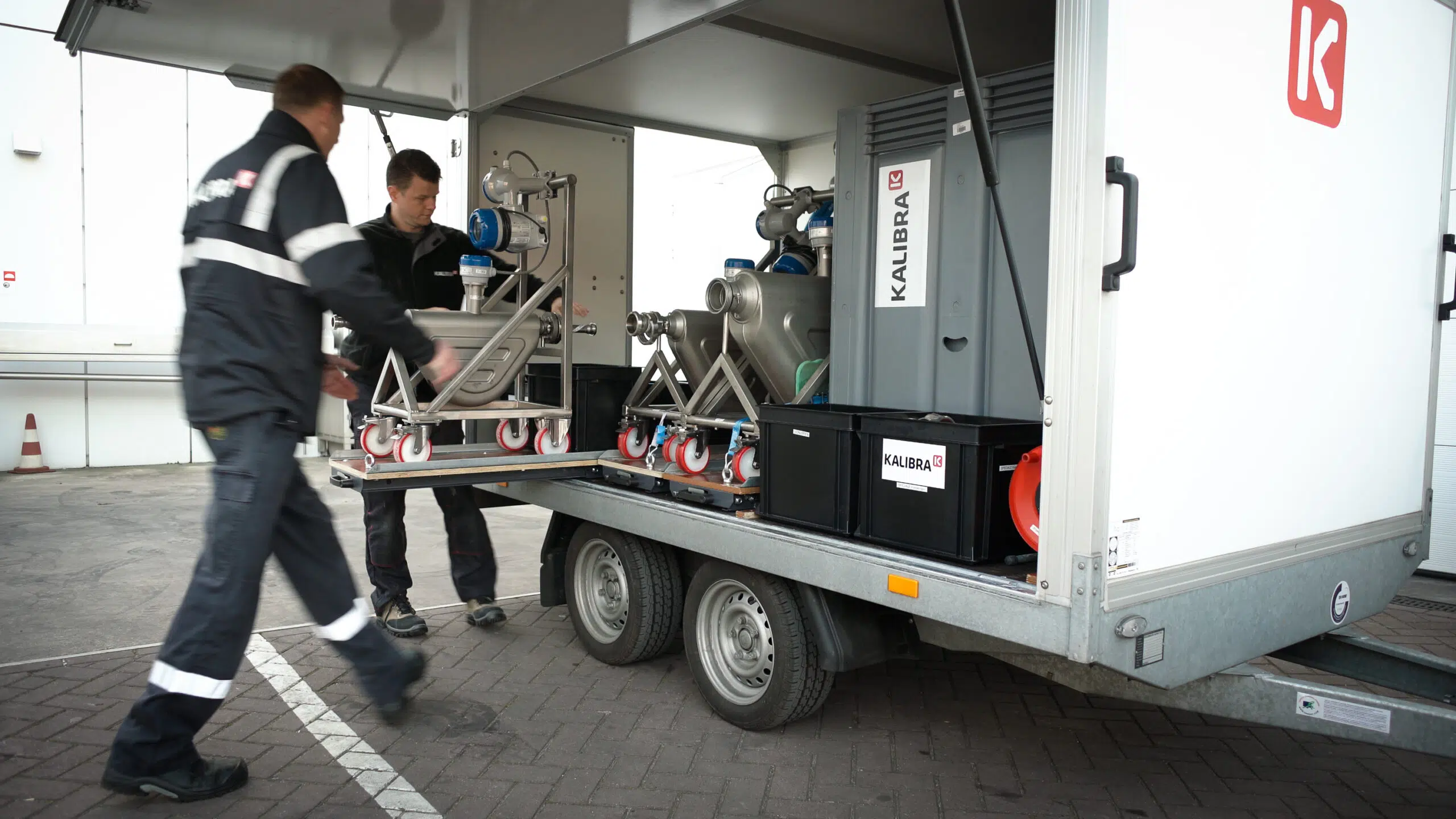 We komen met een aanhanger waarin alle benodigde onderdelen aanwezig zijn: buffervat gevuld met water, pomp, verbindingsslangen en een nauwkeurige referentiemeter. Alles wordt ter plekke opgebouwd. Je hoeft alleen water en stroom beschikbaar te stellen.